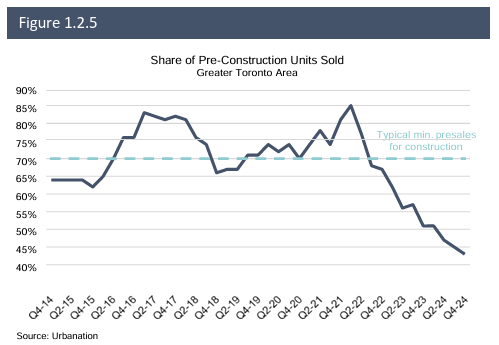 Housing starts in the GTA plummeted 60% in the first half of 2025 to levels not seen since the 1990s on a population adjusted basis. Only 1,276 condo units began construction in Q2 2025, representing an 84% decline from two years earlier. Twenty one projects representing over 4,400 units have been cancelled since 2024, and more cancellations are expected due to continued lack of presale activity.