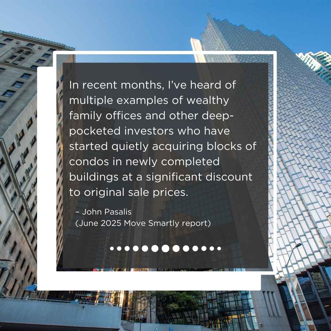 This is documented, not speculation. John Pasalis, president of Realosophy Realty and one of the most respected voices in Toronto real estate data, confirmed this shift in his June 2025 Move Smartly report. He noted that wealthy family offices and deep pocketed investors have started quietly acquiring blocks of condos at significant discounts, effectively filling the gap left by retail investors who can no longer or no longer want to close on overpriced units.