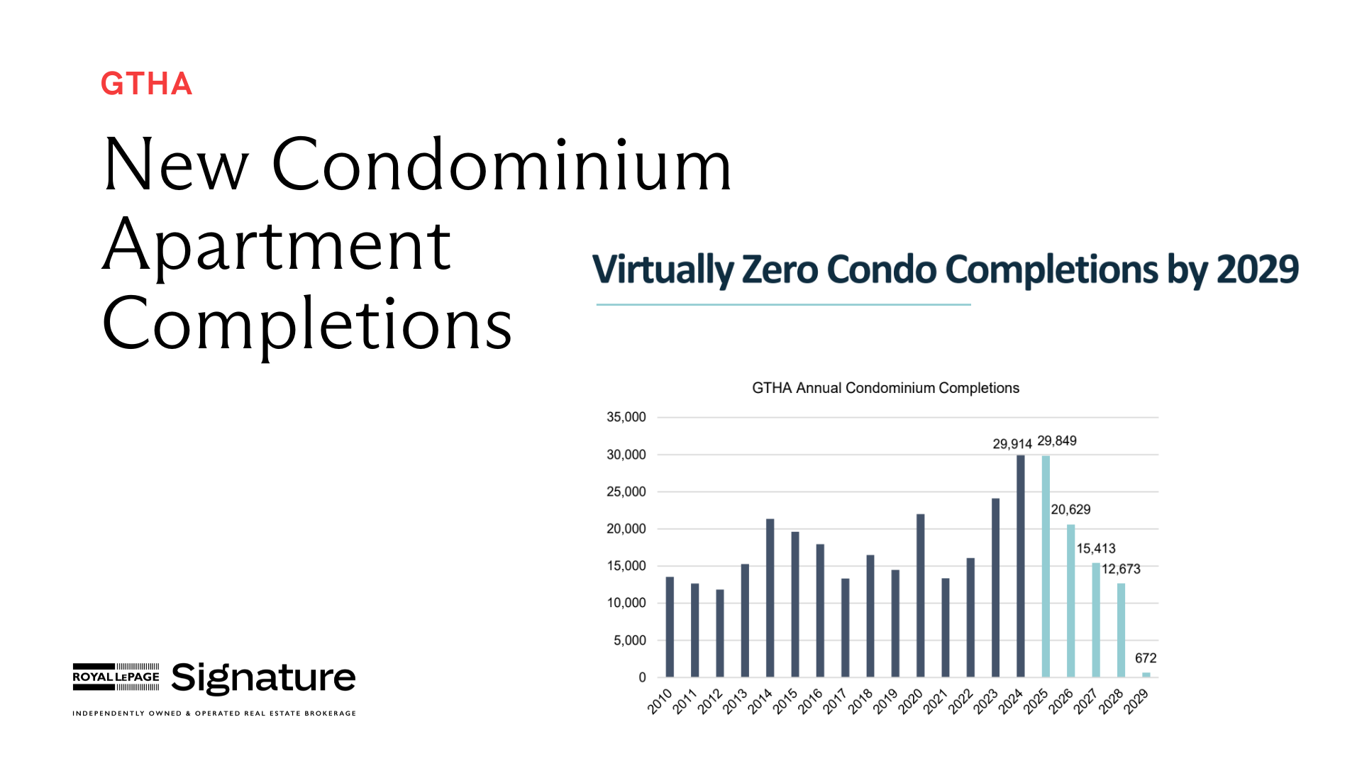 Condo completions in the GTA peaked at nearly 30,000 units in 2023 and 2024. But the pipeline is drying up fast. Completions are projected to fall to approximately 15,000 units by 2027 and under 1,000 units by 2029.